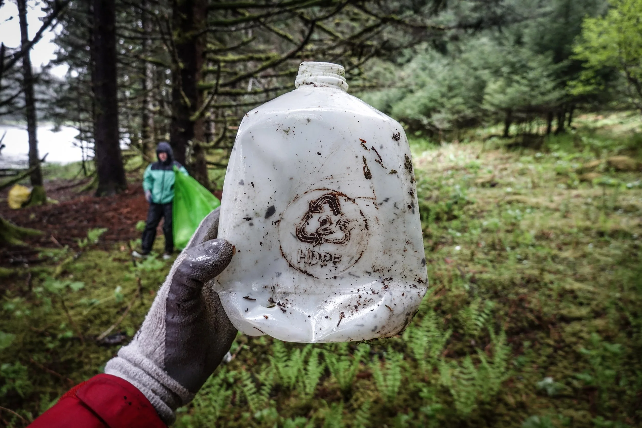 Number 2 Recyclable jug found on Afognak tossed into the tree-line by a winter storm. Photo by Max Romey.
