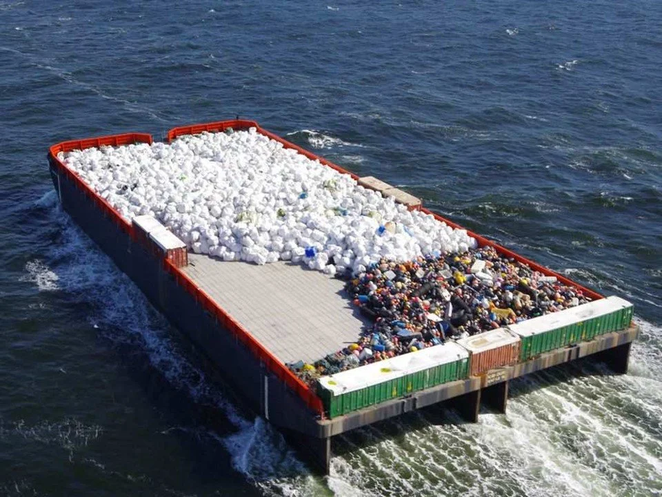 A “mountain of trash” on its way from Alaska to Seattle in 2015. Credit is due to GoAK, as well as Island Trails Network for filling up this 30,000 sq ft barge. The haul weighed approximately 1M lbs.