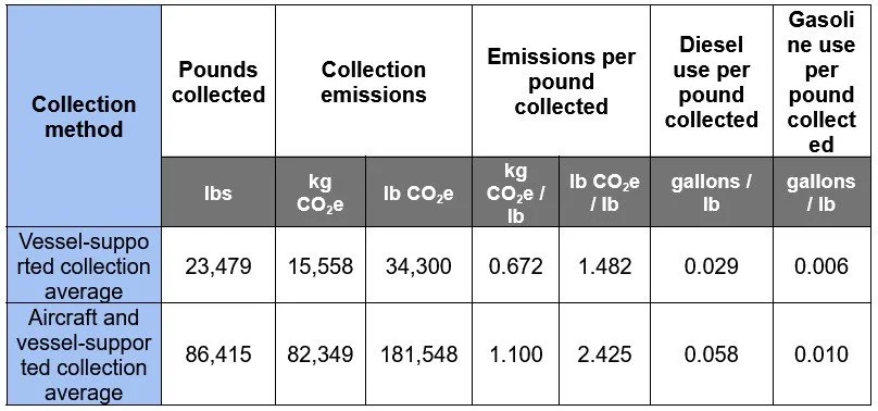 Table 5: Comparing collection methods summarizes emissions per pound collected and associated fuel use intensity. While raw totals are informative, these intensity metrics are more consequential from a management standpoint. They connect operational design directly to carbon outcomes and provide a framework for evaluating logistical decisions, fuel strategies, and equipment deployment.